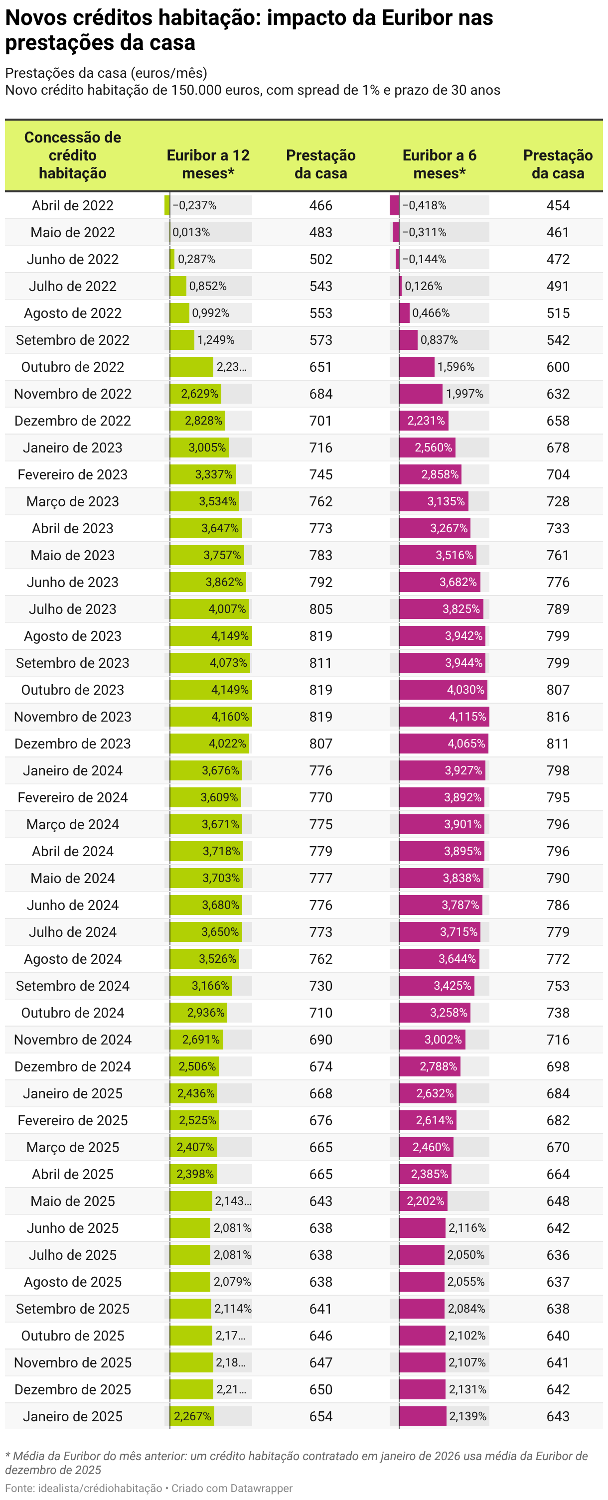 Geral Crédito habitação em janeiro de 2026? Estas são as prestações da casa Taxas Euribor continuam trajetória de subida ligeira na reta final de 2025. Mas impacto nas prestações é pequeno. 05 jan 2026 min de leitura O ano de 2026 arranca com ligeiros aumentos das prestações da casa para os novos créditos habitação a taxa variável. Isto porque as taxas Euribor voltaram a registar uma subida mensal em dezembro, seguindo a tendência observada desde o verão de 2025. Nos contratos existentes, só quem tem empréstimos indexados à Euribor a 12 meses é que verá a prestação da casa a ser revista em baixa em janeiro. Há vários meses que os analistas de mercado têm apontado para uma estabilização da Euribor em torno de 2%, em linha com a manutenção das taxas de juro diretoras do Banco Central Europeu no mesmo patamar desde julho até dezembro de 2025. Mas, desde o verão, têm-se sentido ligeiros aumentos deste indexante mês após mês. Em dezembro não foi diferente. Uma vez mais, Euribor subiu para todos os prazos, ainda que ligeiramente, deixando as taxas médias mensais nos seguintes valores no último mês de 2025: Euribor a 12 meses: fixou-se em 2,267% em dezembro, mais 0,05 pontos percentuais (p.p.) face ao mês anterior; Euribor a 6 meses: média mensal voltou a subir para 2,139% em dezembro, mais 0,008 p.p. do que em novembro; Euribor a 3 meses: aumentou para 2,048% em dezembro, uma subida mensal de 0,006 p.p.. Euribor a 3, 6 e 12 meses: como evoluiu nos últimos anos? Taxa média mensal desde maio de 2007 até dezembro de 2025 200820102012201420162018202020222024−10123456%Euribor 12 mesesDez ’112,008%Euribor 12 mesesDez ’112,008% Euribor 3 meses Euribor 12 meses Euribor 6 meses Criado com Datawrapper Prestações da casa iniciam 2026 com ligeira subida mensal A ligeira subida das médias mensais da Euribor em dezembro foi suficiente para se refletir em alguns euros nas prestações da casa calculadas para os novos créditos habitação contratados em janeiro de 2026. O impacto será maior no prazo mais longo. É isso que mostram as simulações do idealista/créditohabitação, que têm em conta um empréstimo da casa a taxa variável contratado em janeiro (que usa a média mensal da Euribor de dezembro) no valor de 150.000 euros, com spread 1% e prazo de 30 anos: Euribor a 12 meses: a prestação da casa será de 654 euros nos doze meses começados em janeiro de 2026, mais quatro euros face a um empréstimo contratado em dezembro de 2025; Euribor a 6 meses: a prestação da casa a pagar em janeiro e nos cinco meses seguintes será de 643 euros, apenas mais um euro face à prestação calculada para um crédito assinado no último mês de 2025; Euribor a 3 meses: a prestação da casa será de 636 euros nos primeiros três meses do contrato, mais um euro do que no mês anterior. Novos créditos habitação: impacto da Euribor nas prestações da casa Prestações da casa (euros/mês) Novo crédito habitação de 150.000 euros, com spread de 1% e prazo de 30 anos Table with 5 columns and 46 rows. (column headers with buttons are sortable) Concessão de crédito habitação Euribor a 12 meses* Prestação da casa Euribor a 6 meses* Prestação da casa Abril de 2022 −0,237% −0,237% −0,237% 466 −0,418% −0,418% −0,418% 454 Maio de 2022 0,013% 0,013% 0,013% 483 −0,311% −0,311% −0,311% 461 Junho de 2022 0,287% 0,287% 0,287% 502 −0,144% −0,144% −0,144% 472 Julho de 2022 0,852% 0,852% 0,852% 543 0,126% 0,126% 0,126% 491 Agosto de 2022 0,992% 0,992% 0,992% 553 0,466% 0,466% 0,466% 515 Setembro de 2022 1,249% 1,249% 1,249% 573 0,837% 0,837% 0,837% 542 Outubro de 2022 2,233% 2,233% 2,233% 651 1,596% 1,596% 1,596% 600 Novembro de 2022 2,629% 2,629% 2,629% 684 1,997% 1,997% 1,997% 632 Dezembro de 2022 2,828% 2,828% 2,828% 701 2,231% 2,231% 2,231% 658 Janeiro de 2023 3,005% 3,005% 3,005% 716 2,560% 2,560% 2,560% 678 Fevereiro de 2023 3,337% 3,337% 3,337% 745 2,858% 2,858% 2,858% 704 Março de 2023 3,534% 3,534% 3,534% 762 3,135% 3,135% 3,135% 728 Abril de 2023 3,647% 3,647% 3,647% 773 3,267% 3,267% 3,267% 733 Maio de 2023 3,757% 3,757% 3,757% 783 3,516% 3,516% 3,516% 761 Junho de 2023 3,862% 3,862% 3,862% 792 3,682% 3,682% 3,682% 776 Julho de 2023 4,007% 4,007% 4,007% 805 3,825% 3,825% 3,825% 789 Agosto de 2023 4,149% 4,149% 4,149% 819 3,942% 3,942% 3,942% 799 Setembro de 2023 4,073% 4,073% 4,073% 811 3,944% 3,944% 3,944% 799 Outubro de 2023 4,149% 4,149% 4,149% 819 4,030% 4,030% 4,030% 807 Novembro de 2023 4,160% 4,160% 4,160% 819 4,115% 4,115% 4,115% 816 Dezembro de 2023 4,022% 4,022% 4,022% 807 4,065% 4,065% 4,065% 811 Janeiro de 2024 3,676% 3,676% 3,676% 776 3,927% 3,927% 3,927% 798 Fevereiro de 2024 3,609% 3,609% 3,609% 770 3,892% 3,892% 3,892% 795 Março de 2024 3,671% 3,671% 3,671% 775 3,901% 3,901% 3,901% 796 Abril de 2024 3,718% 3,718% 3,718% 779 3,895% 3,895% 3,895% 796 Maio de 2024 3,703% 3,703% 3,703% 777 3,838% 3,838% 3,838% 790 Junho de 2024 3,680% 3,680% 3,680% 776 3,787% 3,787% 3,787% 786 Julho de 2024 3,650% 3,650% 3,650% 773 3,715% 3,715% 3,715% 779 Agosto de 2024 3,526% 3,526% 3,526% 762 3,644% 3,644% 3,644% 772 Setembro de 2024 3,166% 3,166% 3,166% 730 3,425% 3,425% 3,425% 753 Outubro de 2024 2,936% 2,936% 2,936% 710 3,258% 3,258% 3,258% 738 Novembro de 2024 2,691% 2,691% 2,691% 690 3,002% 3,002% 3,002% 716 Dezembro de 2024 2,506% 2,506% 2,506% 674 2,788% 2,788% 2,788% 698 Janeiro de 2025 2,436% 2,436% 2,436% 668 2,632% 2,632% 2,632% 684 Fevereiro de 2025 2,525% 2,525% 2,525% 676 2,614% 2,614% 2,614% 682 Março de 2025 2,407% 2,407% 2,407% 665 2,460% 2,460% 2,460% 670 Abril de 2025 2,398% 2,398% 2,398% 665 2,385% 2,385% 2,385% 664 Maio de 2025 2,143% 2,143% 2,143% 643 2,202% 2,202% 2,202% 648 Junho de 2025 2,081% 2,081% 2,081% 638 2,116% 2,116% 2,116% 642 Julho de 2025 2,081% 2,081% 2,081% 638 2,050% 2,050% 2,050% 636 Agosto de 2025 2,079% 2,079% 2,079% 638 2,055% 2,055% 2,055% 637 Setembro de 2025 2,114% 2,114% 2,114% 64