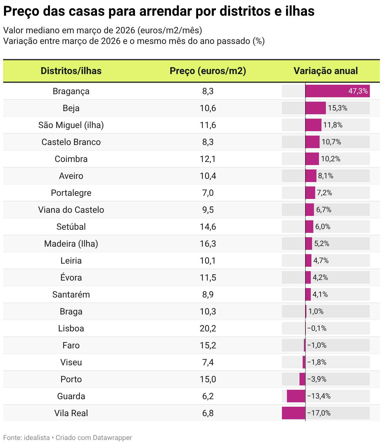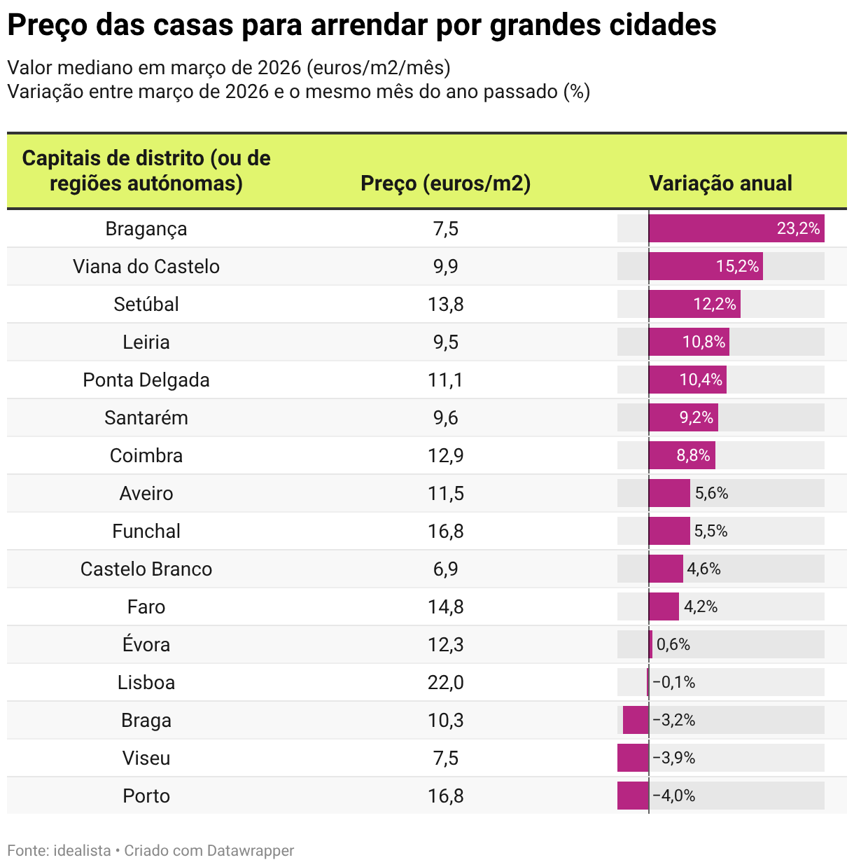 Renda das casas em Portugal desce 1,2% em março – é o 3º mês em queda Arrendar casa ficou mais barato em cinco distritos no último ano, entre os quais está o Porto e Faro, mostra idealista. 02 abr 2026 min de leitura A procura de casas para arrendar em Portugal continua bem forte. Mas têm-se assistido a um aumento da oferta residencial de maior dimensão, o que tem tido impacto em baixa nas rendas. Em março, os preços das casas para arrendar no país desceram 1,2%, sendo este o terceiro mês de quedas consecutivas (em janeiro recuaram 1,9% e em fevereiro diminuíram 1,4%), mostra o índice de preços do idealista. Assim, arrendar casa em Portugal passou a ter o custo mediano de 16,4 euros por metro quadrado (euros/m2) no final de março de 2026, afastando-se do máximo histórico de 17 euros/m2, registado em outubro de 2025. Maioria das grandes cidades com casas para arrendar mais caras Apesar de se registar uma descida anual das rendas das casas a nível nacional, a verdade é que os custos de arrendamento aumentaram em 12 das 16 capitais de distrito (ou de regiões autónomas) analisadas. As maiores subidas anuais das rendas das casas foram registadas em Bragança (23,2%), Viana do Castelo (15,2%) e Setúbal (12,2%). Seguem-se Leiria (10,8%), Ponta Delgada (10,4%), Santarém (9,2%) e Coimbra (8,8%). Também se observaram aumentos das rendas em Aveiro (5,6%), Funchal (5,5%), Castelo Branco (4,6%) e Faro (4,2%), enquanto Évora (0,6%) apresentou uma subida ligeira. Já em Lisboa (-0,1%), os preços das casas para arrendar mantiveram-se estáveis. Em sentido contrário, registaram-se descidas anuais nas rendas no Porto (-4%), Viseu (-3,9%) e em Braga (-3,2%), mostram ainda os dados do idealista. Lisboa continua a ser a cidade mais cara para arrendar casa, com um preço mediano de 22 euros/m2, seguida do Porto (16,8 euros/m2) e do Funchal (16,8 euros/m2). Logo depois surgem Faro (14,8 euros/m2), Setúbal (13,8 euros/m2), Coimbra (12,9 euros/m2), Évora (12,3 euros/m2), Aveiro (11,5 euros/m2) e Ponta Delgada (11,1 euros/m2). No segmento intermédio encontram-se Braga (10,3 euros/m2), Viana do Castelo (9,9 euros/m2), Santarém (9,6 euros/m2) e Leiria (9,5 euros/m2). As capitais mais económicas para arrendar uma habitação continuam a ser Viseu (7,5 euros/m2), Bragança (7,5 euros/m2) e Castelo Branco (6,9 euros/m2). Preço das casas para arrendar por grandes cidades Valor mediano em março de 2026 (euros/m2/mês) Variação entre março de 2026 e o mesmo mês do ano passado (%) Table with 3 columns and 16 rows. (column headers with buttons are sortable) Capitais de distrito (ou de regiões autónomas) Preço (euros/m2) Variação anual Bragança 7,5 23,2% 23,2% 23,2% Viana do Castelo 9,9 15,2% 15,2% 15,2% Setúbal 13,8 12,2% 12,2% 12,2% Leiria 9,5 10,8% 10,8% 10,8% Ponta Delgada 11,1 10,4% 10,4% 10,4% Santarém 9,6 9,2% 9,2% 9,2% Coimbra 12,9 8,8% 8,8% 8,8% Aveiro 11,5 5,6% 5,6% 5,6% Funchal 16,8 5,5% 5,5% 5,5% Castelo Branco 6,9 4,6% 4,6% 4,6% Faro 14,8 4,2% 4,2% 4,2% Évora 12,3 0,6% 0,6% 0,6% Lisboa 22,0 −0,1% −0,1% −0,1% Braga 10,3 −3,2% −3,2% −3,2% Viseu 7,5 −3,9% −3,9% −3,9% Porto 16,8 −4,0% −4,0% −4,0% Fonte: idealistaDescarregar estes dadosIncorporar Descarregar imagemCriado com Datawrapper Distrito de Lisboa com rendas estáveis – e no Porto descem quase 4% Nos últimos 12 meses, os preços das casas para arrendar subiram em 14 dos 20 distritos e ilhas analisados, mantiveram-se estáveis num território e desceram nos restantes cinco. A maior subida anual das rendas das casas registou-se em Bragança (47,3%), seguida de Beja (15,3%), ilha de São Miguel (11,8%), Castelo Branco (10,7%) e Coimbra (10,2%). Registaram-se ainda aumentos em Aveiro (8,1%), Portalegre (7,2%), Viana do Castelo (6,7%), Setúbal (6%), ilha da Madeira (5,2%), Leiria (4,7%), Évora (4,2%), Santarém (4,1%) e Braga (1%). Já em Lisboa (-0,1%), os preços mantiveram-se estáveis. Em sentido contrário, as maiores descidas anuais das rendas das casas observaram-se em Vila Real (-17%), Guarda (-13,4%), Porto (-3,9%), Viseu (-1,8%) e Faro (-1%). O distrito de Lisboa lidera o ranking dos distritos e ilhas mais caras para arrendar casa, com um preço mediano de 20,2 euros/m2, seguido da ilha da Madeira (16,3 euros/m2) e de Faro (15,2 euros/m2). Logo depois surgem Porto (15 euros/m2) e Setúbal (14,6 euros/m2). Com valores de arrendamento habitacional iguais ou acima dos 10 euros/m2 encontram-se ainda Coimbra (12,1 euros/m2), ilha de São Miguel (11,6 euros/m2), Évora (11,5 euros/m2), Beja (10,6 euros/m2), Aveiro (10,4 euros/m2), Braga (10,3 euros/m2) e Leiria (10,1 euros/m2). No segmento intermédio estão Viana do Castelo (9,5 euros/m2), Santarém (8,9 euros/m2), Bragança (8,3 euros/m2) e Castelo Branco (8,3 euros/m2). Os distritos mais acessíveis para arrendar casa continuam a ser Viseu (7,4 euros/m2), Portalegre (7 euros/m2), Vila Real (6,8 euros/m2) e Guarda (6,2 euros/m2). Preço das casas para arrendar por distritos e ilhas Valor mediano em março de 2026 (euros/m2/mês) Variação entre março de 2026 e o mesmo mês do ano passado (%) Table with 3 columns and 20 rows. (column headers with buttons are sortable) Distritos/ilhas Preço (euros/m2) Variação anual Bragança 8,3 47,3% 47,3% 47,3% Beja 10,6 15,3% 15,3% 15,3% São Miguel (ilha) 11,6 11,8% 11,8% 11,8% Castelo Branco 8,3 10,7% 10,7% 10,7% Coimbra 12,1 10,2% 10,2% 10,2% Aveiro 10,4 8,1% 8,1% 8,1% Portalegre 7,0 7,2% 7,2% 7,2% Viana do Castelo 9,5 6,7% 6,7% 6,7% Setúbal 14,6 6,0% 6,0% 6,0% Madeira (Ilha) 16,3 5,2% 5,2% 5,2% Leiria 10,1 4,7% 4,7% 4,7% Évora 11,5 4,2% 4,2% 4,2% Santarém 8,9 4,1% 4,1% 4,1% Braga 10,3 1,0% 1,0% 1,0% Lisboa 20,2 −0,1% −0,1% −0,1% Faro 15,2 −1,0% −1,0% −1,0% Viseu 7,4 −1,8% −1,8% −1,8% Porto 15,0 −3,9% −3,9% −3,9% Guarda 6,2 −13,4% −13,4% −13,4% Vila Real 6,8 −17,0% −17,0% −17,0% Fonte: idealistaDescarregar estes dadosIncorporar Descarregar imagemCr